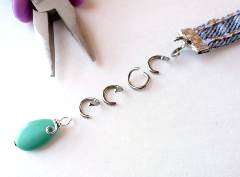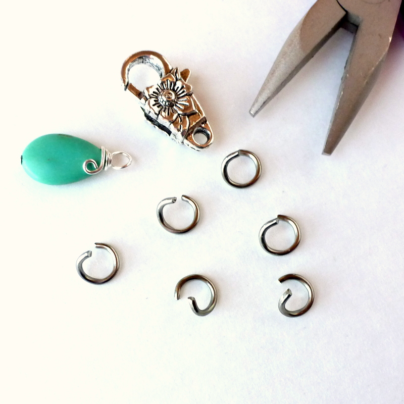 Next, grab a few jump rings, a pretty clasp and a little bead dangle or charm. Open all the jump rings in advance, it saves time: