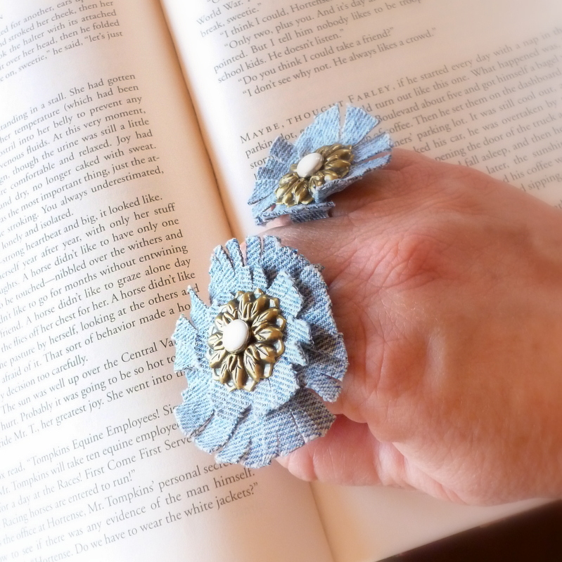 Hi again! It's time to reveal the answer to this week's Guess The Mystery Thing challenge. My readers have been trying to identify the mysterious metal flowers in the center of these upcycled blue jean cocktail rings: