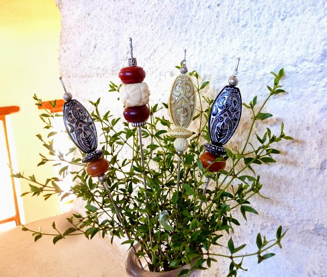 I have a wonderfully SIMPLE way to turn these fabulous sticks into beaded wonders, perfect for bejeweling potted plants, adding to cut flower arrangements or displaying on their own.