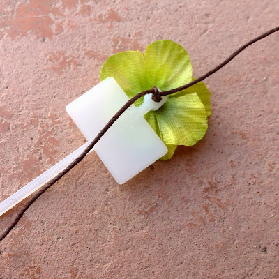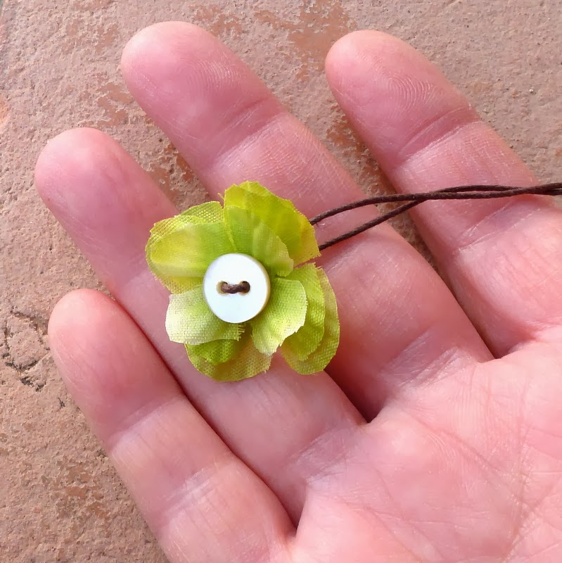 Tie a knot in back (make sure the knot is chunky enough not to slip back through the hole). Then trim the ends.