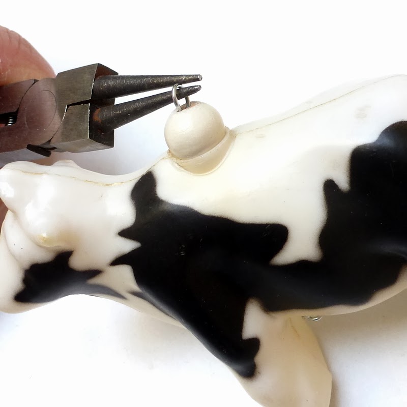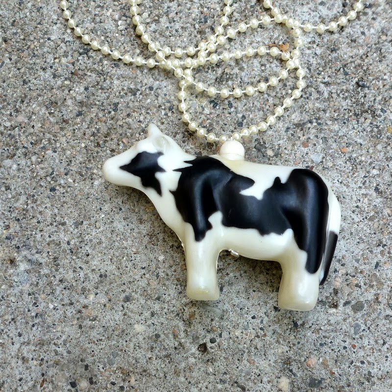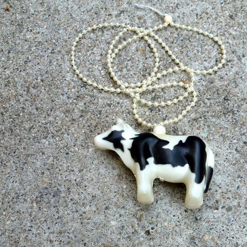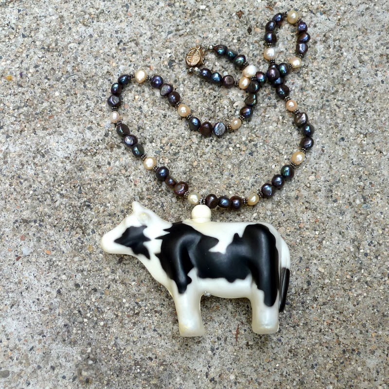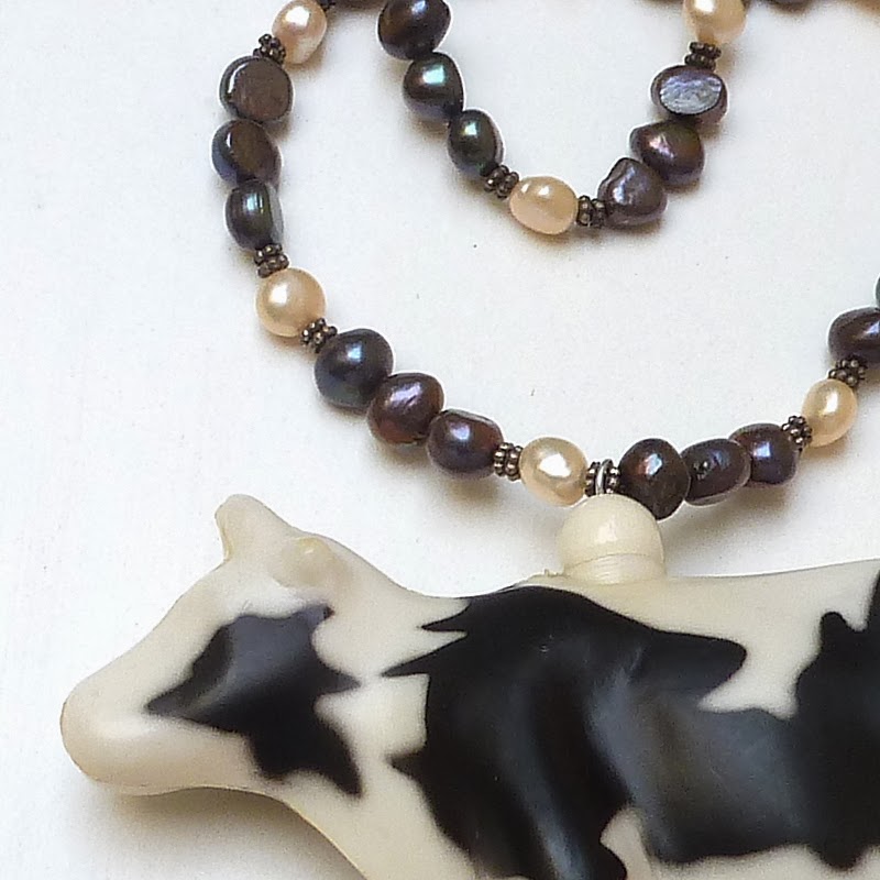 Going a little more schmancy, I strung another li'l cow with big freshwater pearls and a sterling silver clasp.
