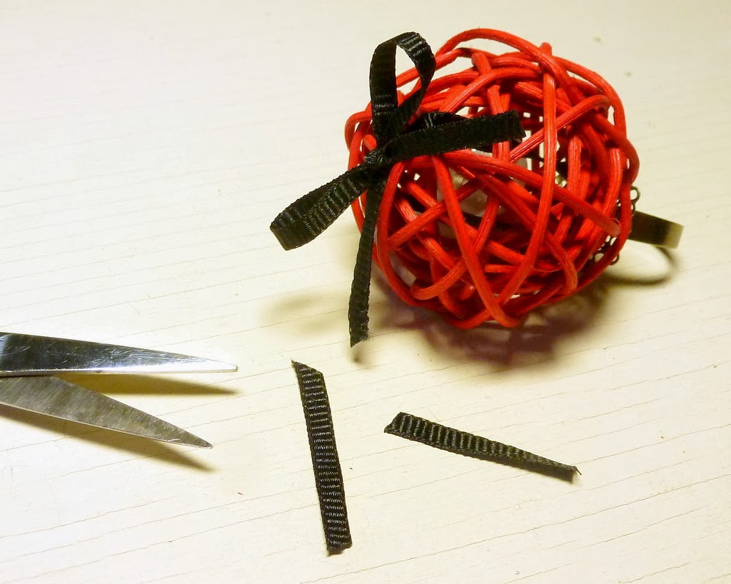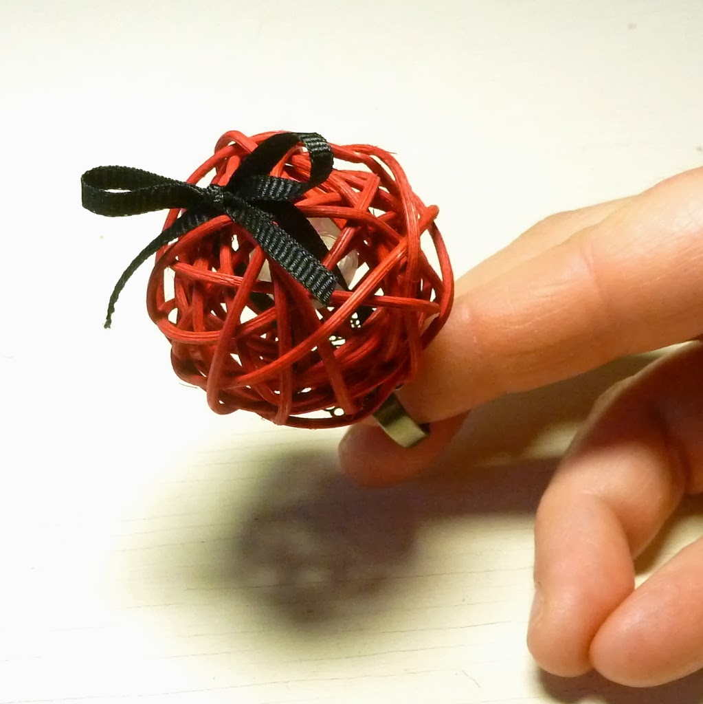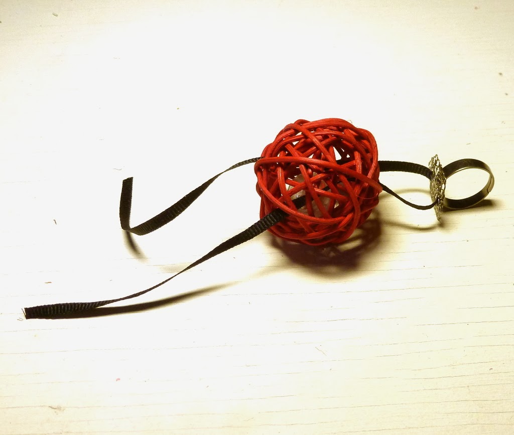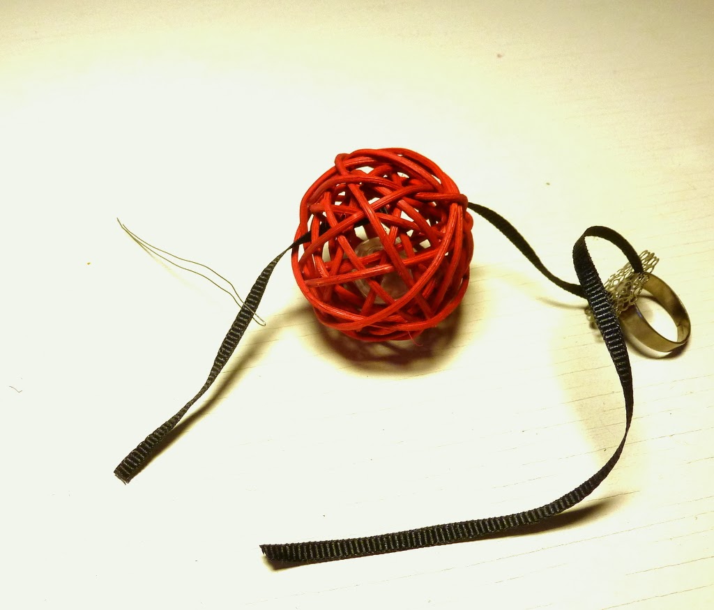 Ready to DIY? Let's start with the cocktail ring. You need a kitty ball, a ring blank and some skinny ribbon.