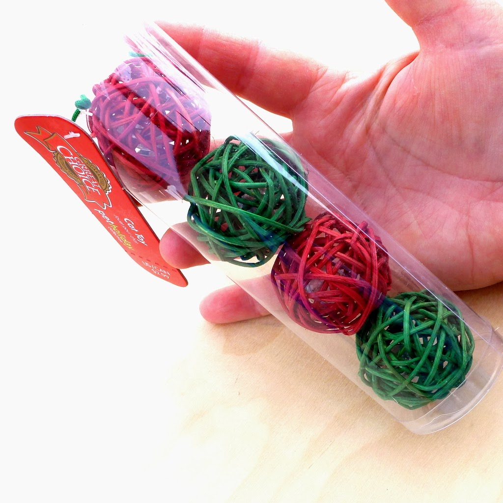 You know what's fun to do in January? Buy super cheap discounted Christmas stuff in red-and-green...fer example, I got these kitty balls for 97 cents...