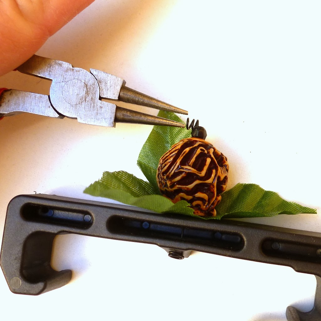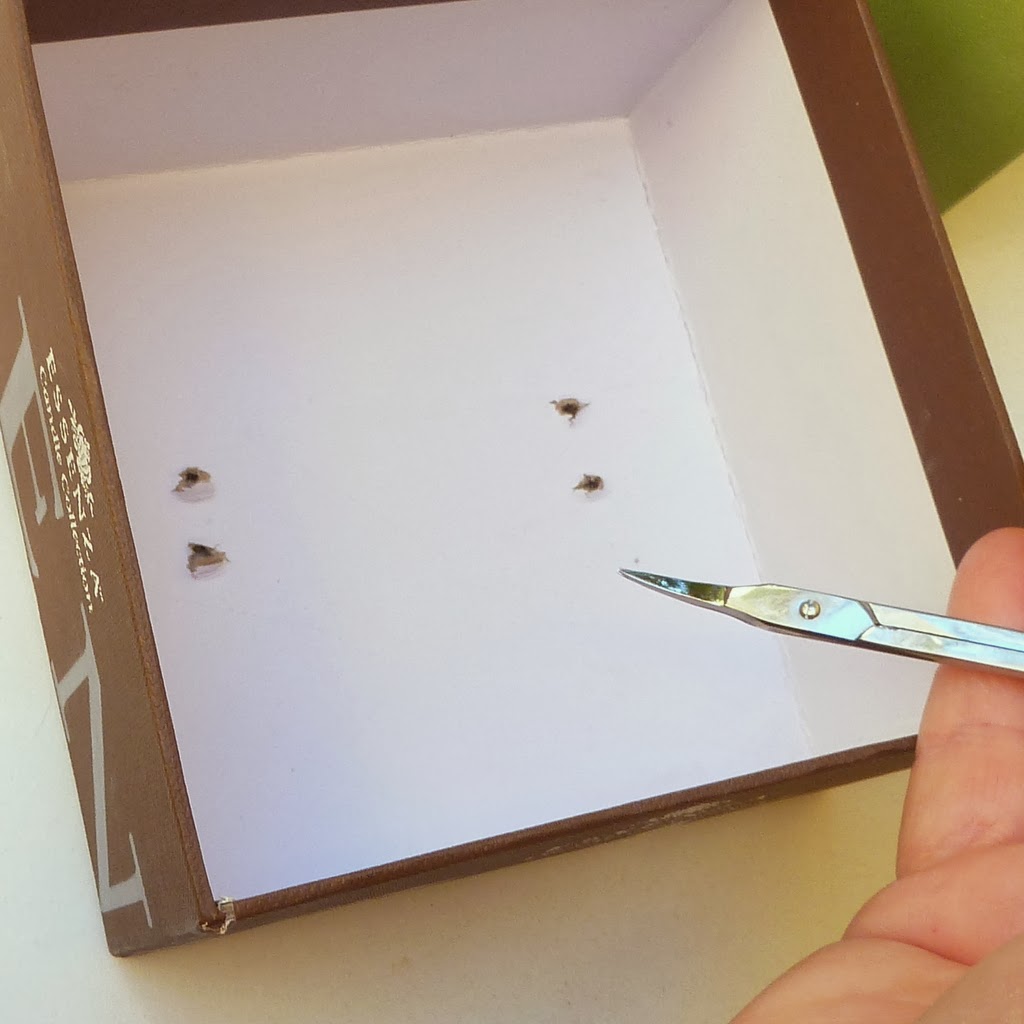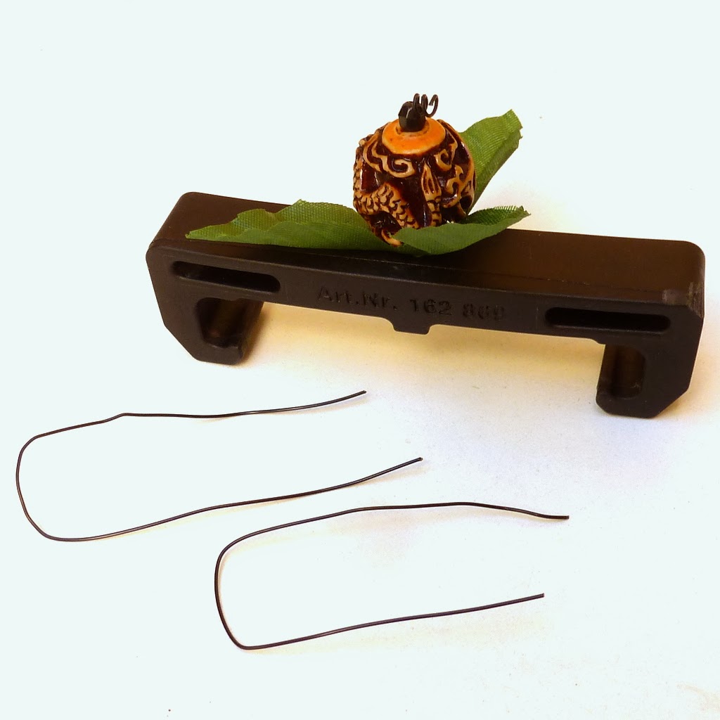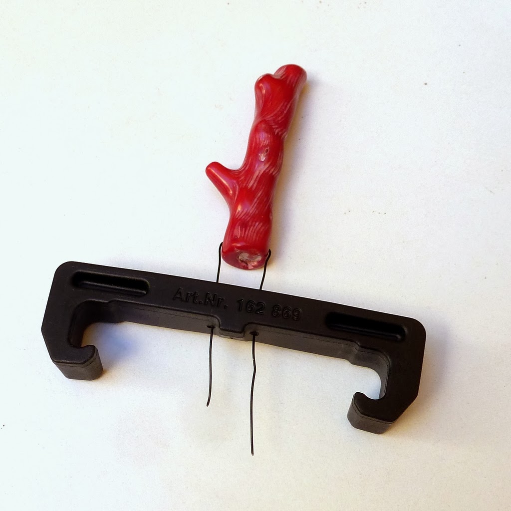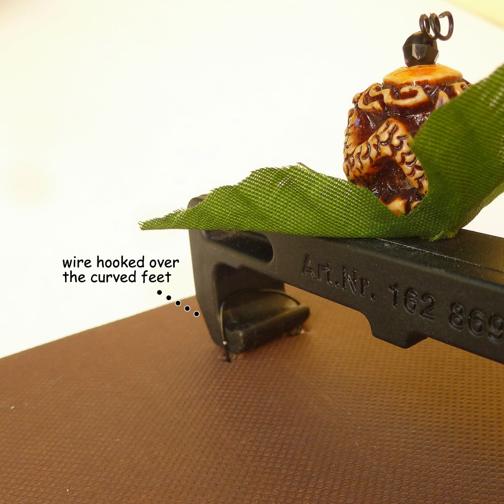 The simplest method to attach the handles: I punched two pairs of holes in a box lid, then wired the doohickie on like so: