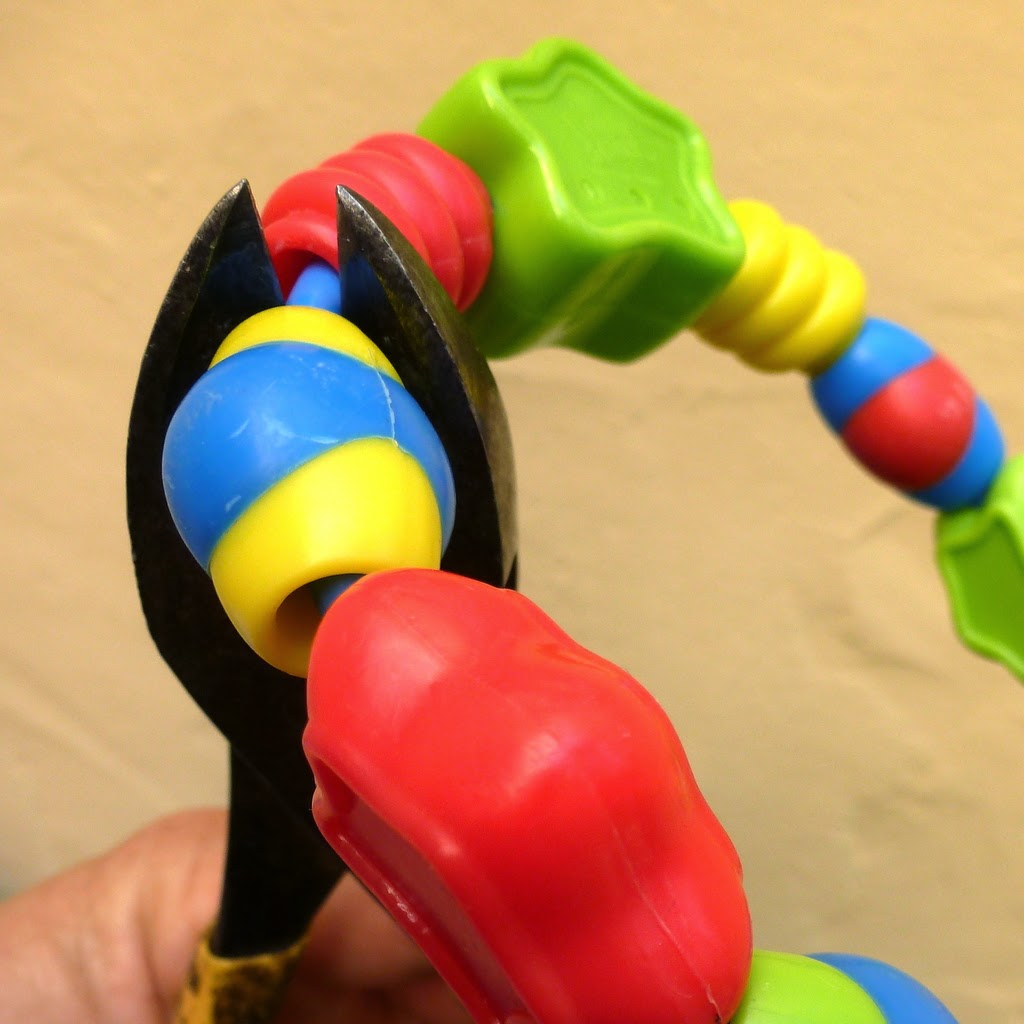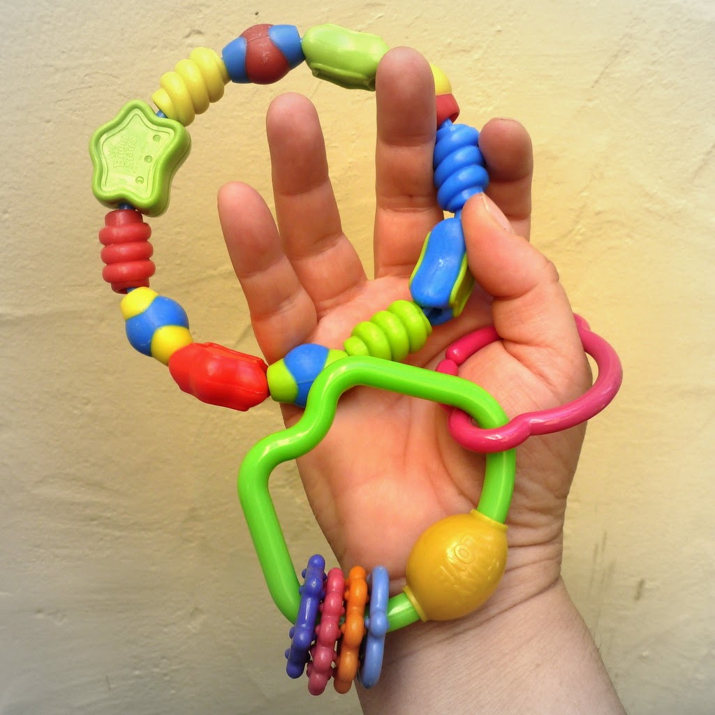 So here's my important tip for choosing the baby toys. Ready? It's this: only use items with a logo from a reputable company. (Fisher Price, Playskool, Disney, etc.) Avoid off-brand labels. Eschew vintage items. Reject no-name toys. Even though most everything will be made in China, the major brands have manufacturing standards, and you can be confident the beads are non-toxic and safe for chomping.