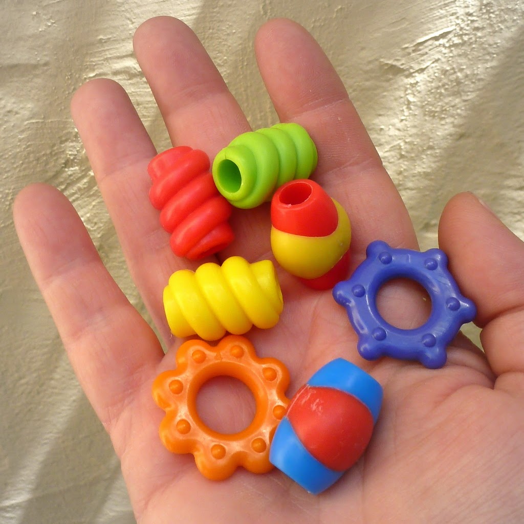 Cleaning tips! To sanitize used toys, run them through the dishwasher. Or swish them in a solution of one part bleach to eight parts water, rinse well, then wash again with soap and hot water. For new toys, a good soapy wash in hot water is fine. You can hand wash the finished necklace as often as you like.