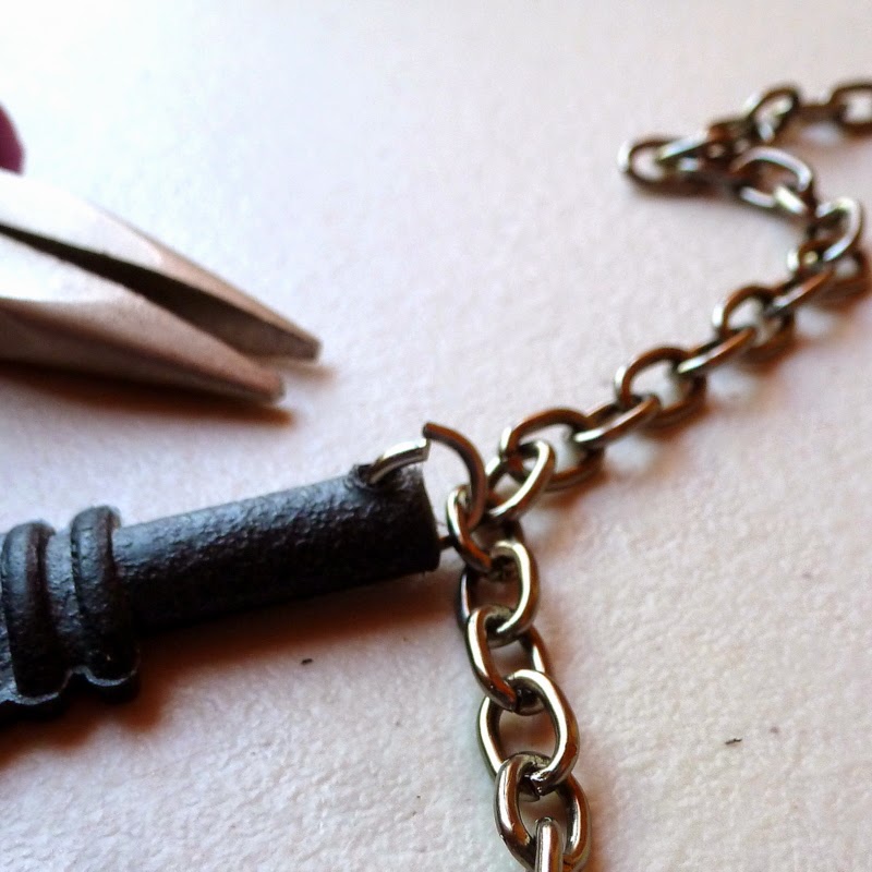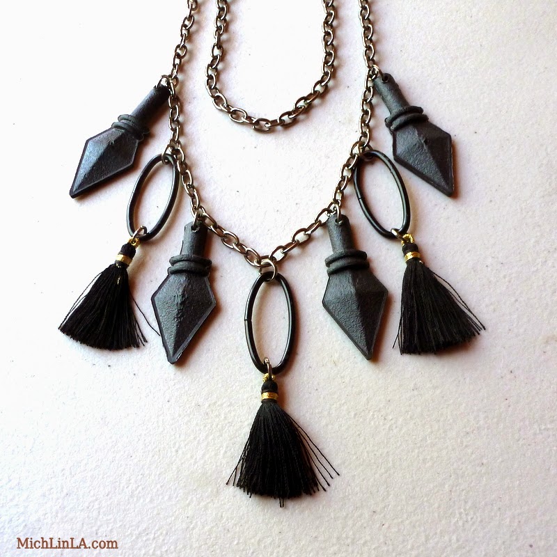 Use another jump ring to attach the link/tassel combo to the center of a necklace chain. I chose a chain with a dark gunmetal finish.