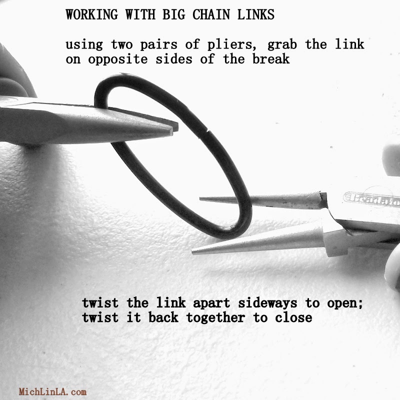 It's easy to harvest big chain links for jewelry making. You just need two pairs of pliers, and a bit of gentle force in a twisting motion.