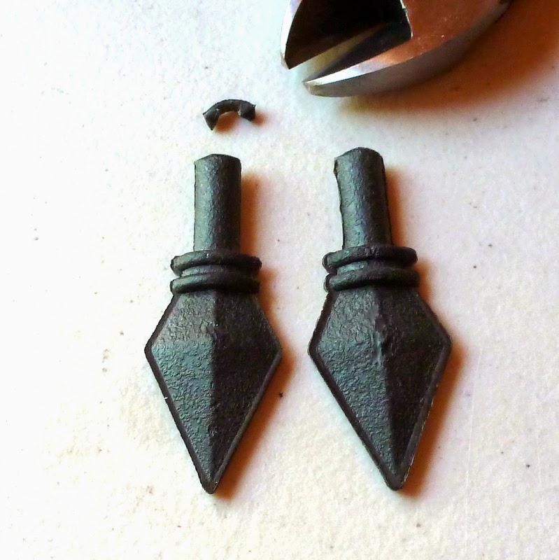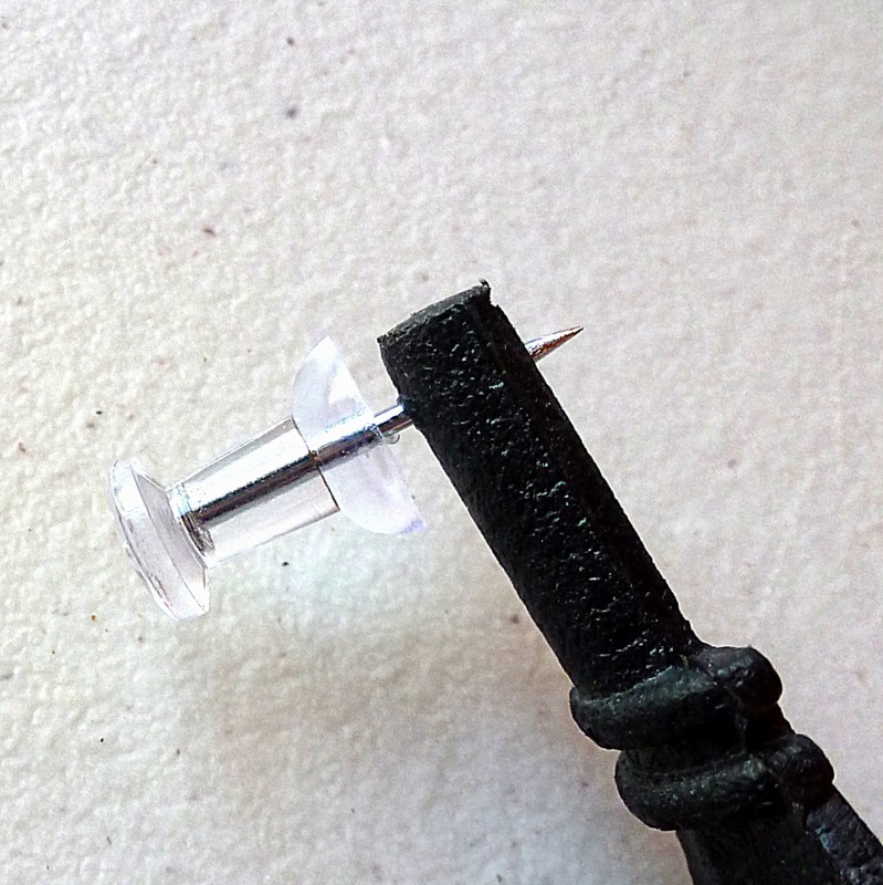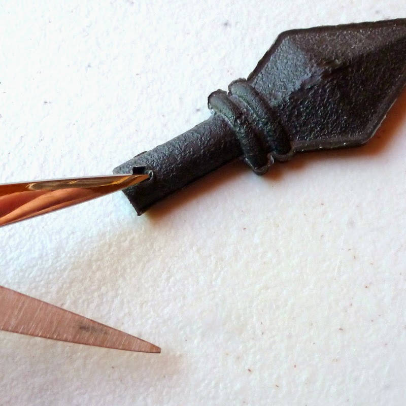 With a push pin, poke a starter hole near the top of the spike. Then enlarge the hole a bit, using small scissors or a skewer. It just needs to be wide enough to admit a jump ring.