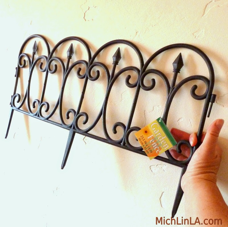 A plastic, super realistic "wrought iron" garden fence. From the dollar store! Specifically, the 99 Cents Only store. Run out and get yourself a fabulous fake fence, because here comes the DIY.