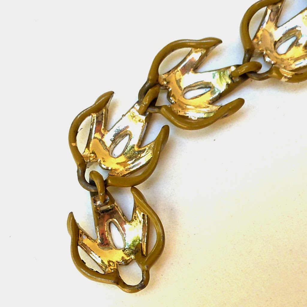 The bracelet was beautiful (if a little bit granny), but one of the links was broken. I arranged them in line for the 'before' pic, but the poor thing wasn't fixable. So I took it all apart with a simple lift of the linker hooks.