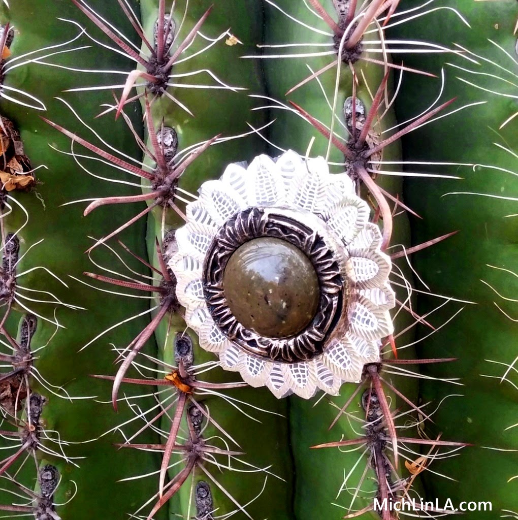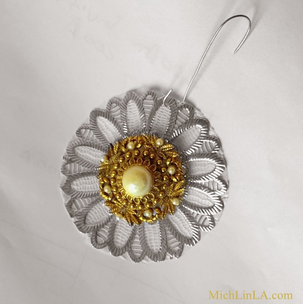 One tip about the placement of the wire ornament hanger. You know how most earring posts and pin backs are usually off center? After adding your jewel to the flower, do a little swing test to see how the jewel is balanced. Then attach the hanger at whichever spot will best allow it to hang correctly and not flop forward.