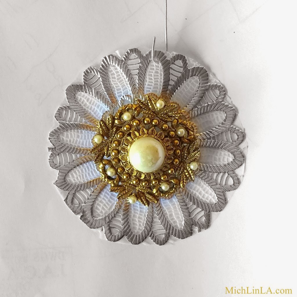 To make the ornament, cut out a metallic lace flower as a simple circle, like so: