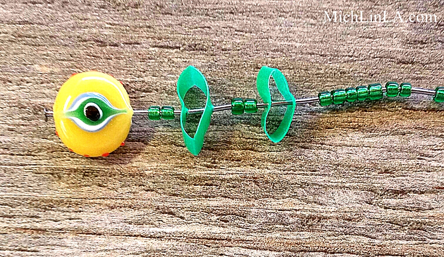 On a long headpin, thread a pretty bead for the flower. Then intersperse the leaves with seed beads, like so: