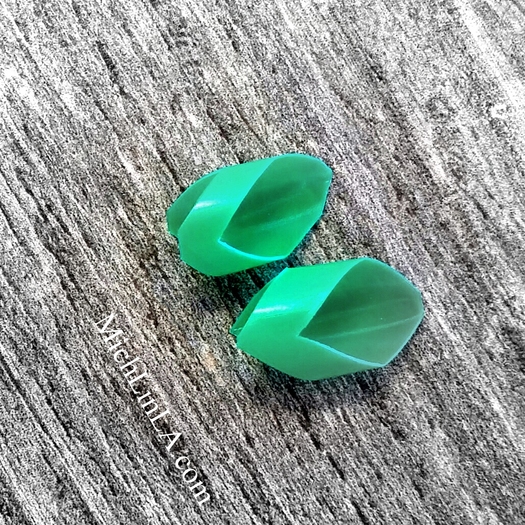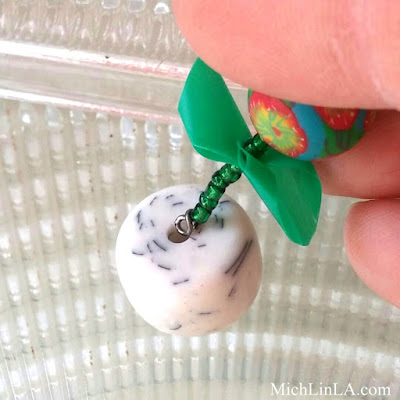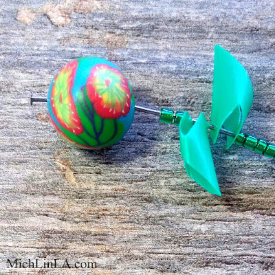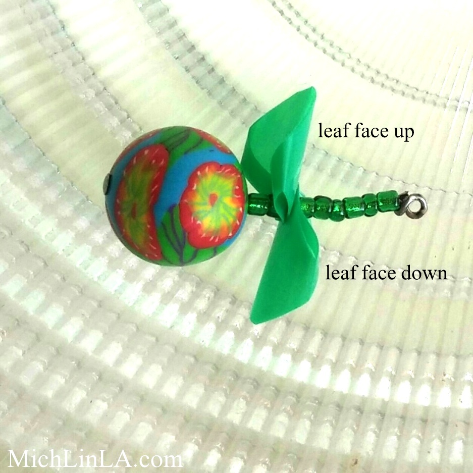 Use a pin to poke a hole in each double-snipped end. On a headpin, thread a "flower" bead and a couple of green seed beads. Now here's the important bit: when adding the leaf segments, flip one leaf over, so the two pieces nest back-to-back.