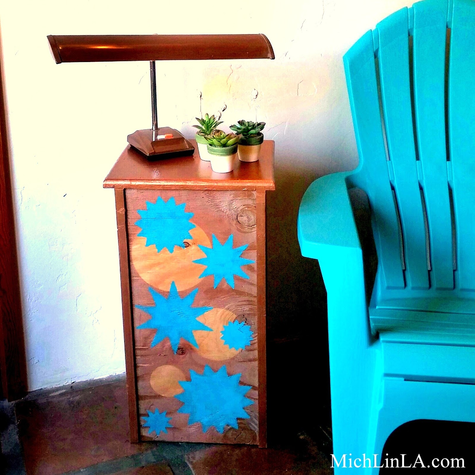 For the two-tone blue table, there's one more step. I popped the stars out of a bunch more stencils, and laid them out on the surface to decide on placement.