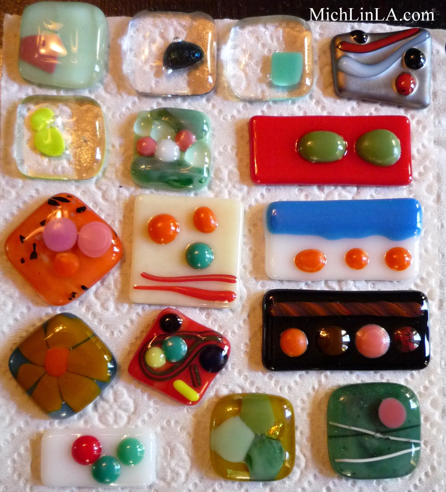 I thought you guys might enjoy seeing where this concept came from. I took a class on fused glass cabochon making, and here's some of what I created.