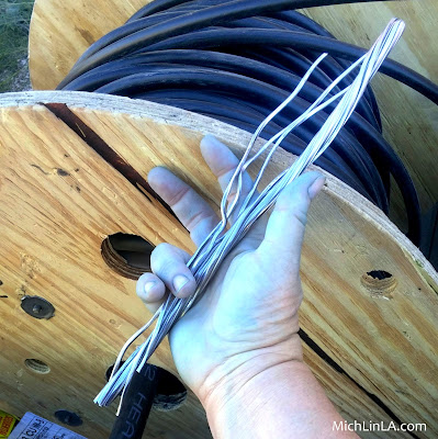 Bored, I glanced around at the work site. And found...these! Scraps of thick aluminum wire, which is what's inside the electrical cable.