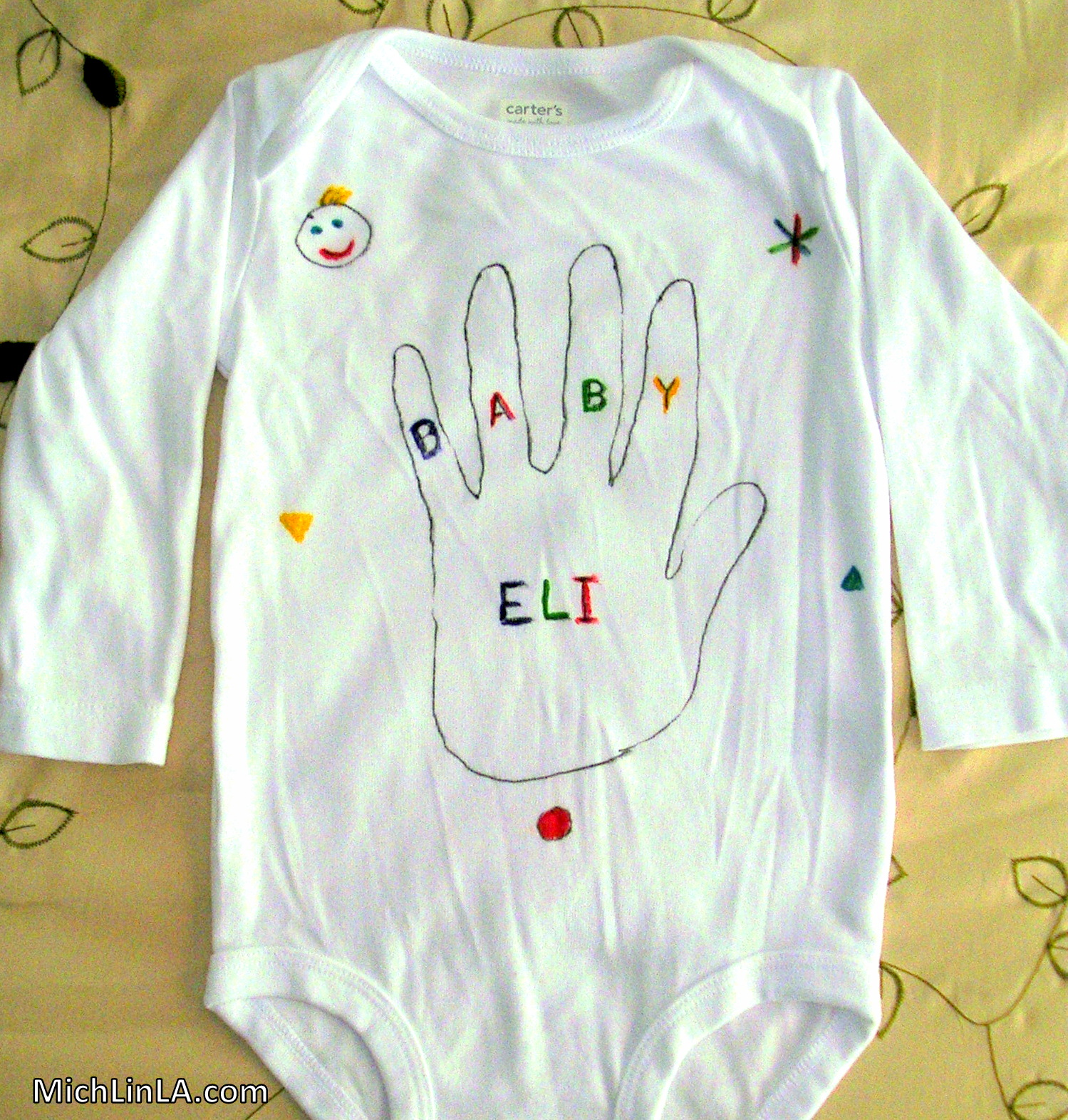 Interesting side note: my mom and I painted onesies together, at the same kitchen table, using the exact same materials. The two turned out different as chalk and cheese. Here's mom's version.
