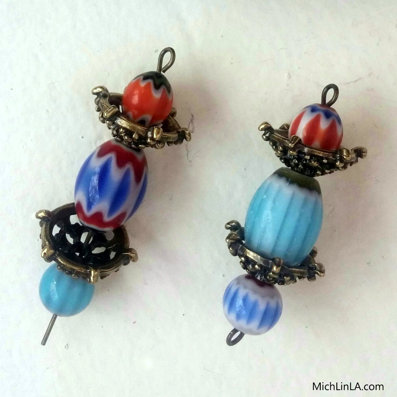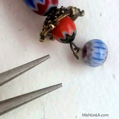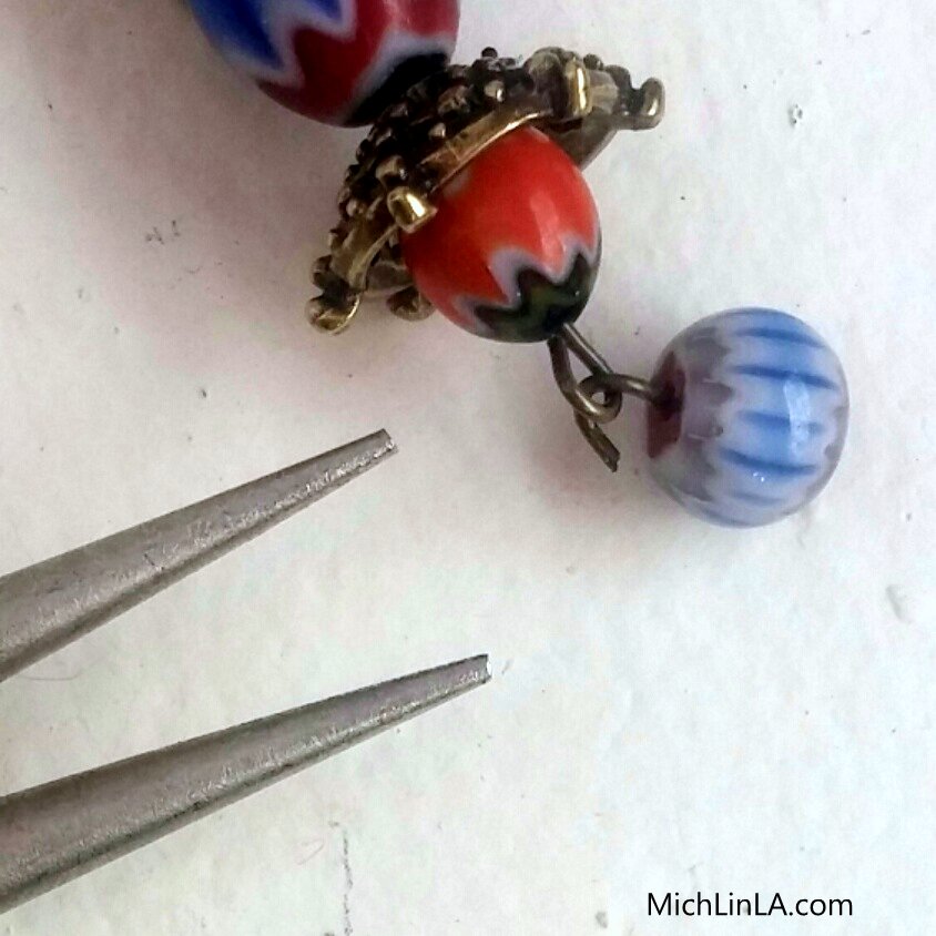 Step 2: use the eye pins to make two longer dangles, with alternating beads and bead caps.
