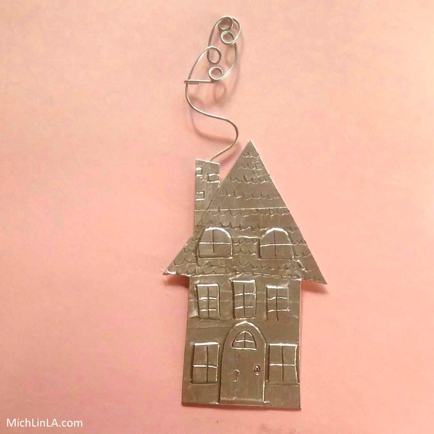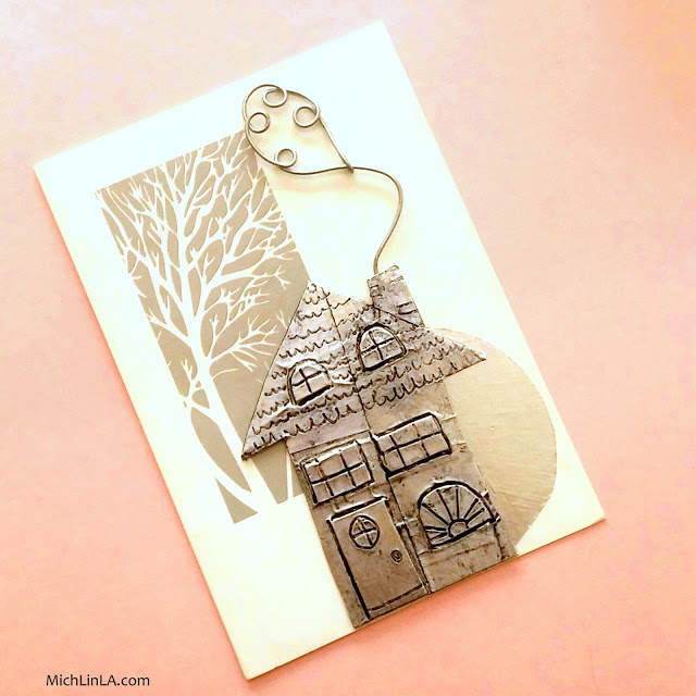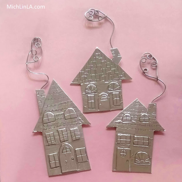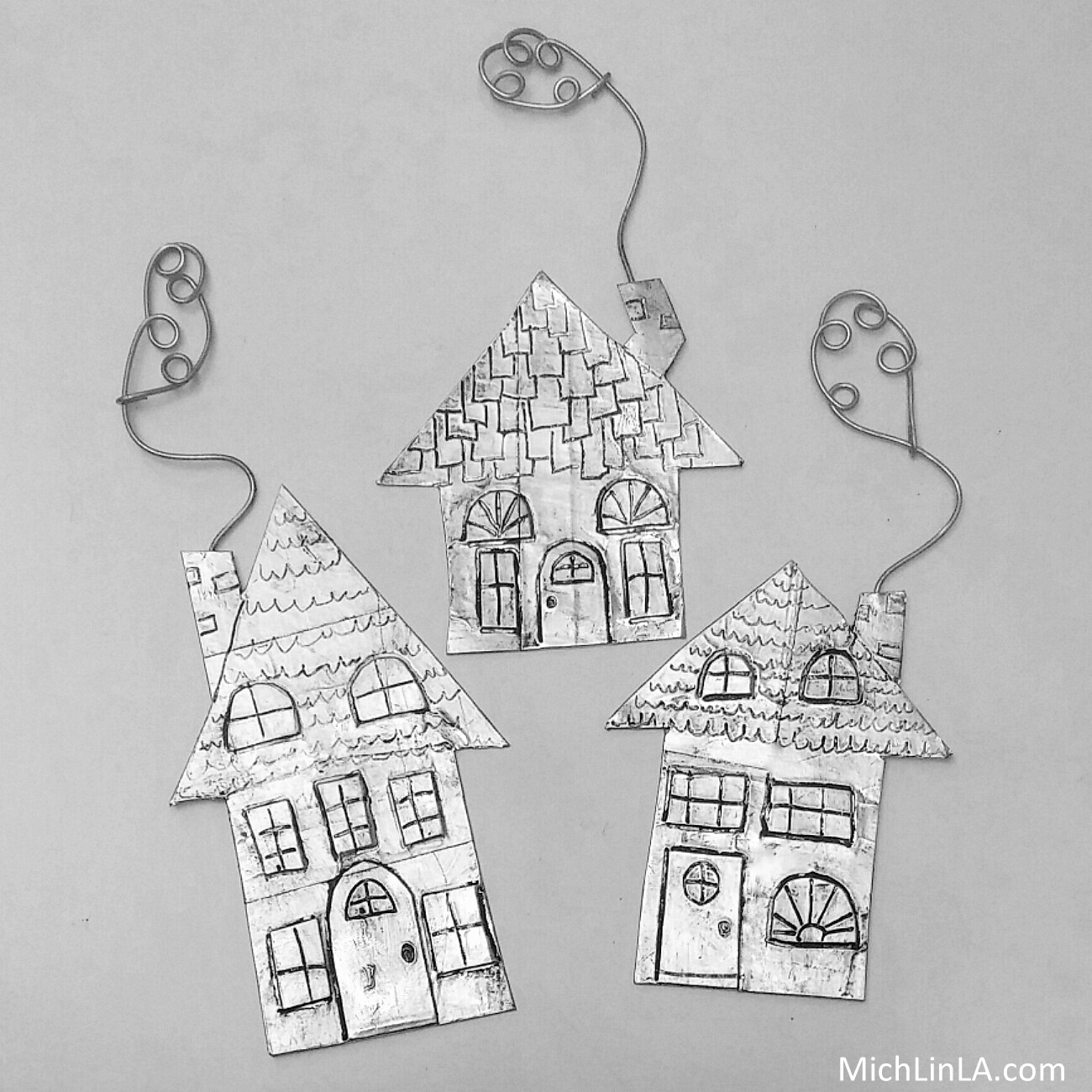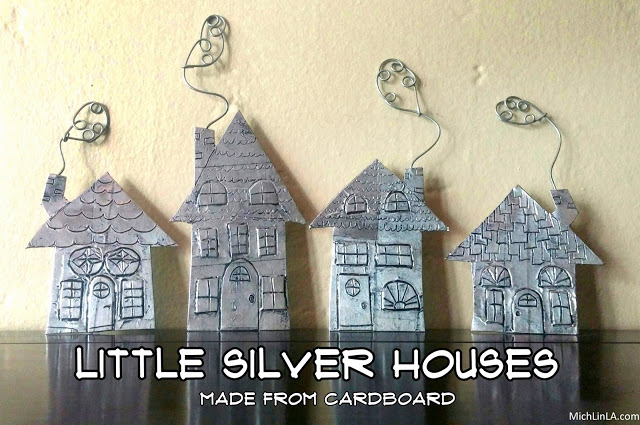 Once, long ago, I made some teeny little silver house ornaments, using recycled cardboard. These new ones are a bit bigger, with a fresh technique and several different uses. And...antiqued!
