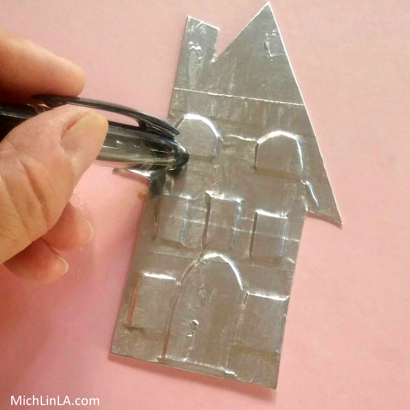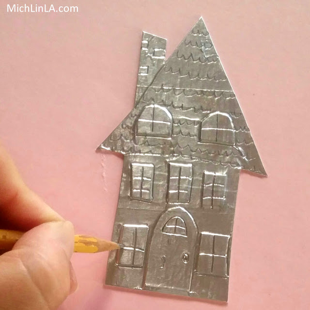 Now to etch in the details. Use a blunt pencil or a ball-point pen - very sophisticated tools, eh? Outline the raised door and windows first. Then add cross-hatched windowpanes, a doorknob and roof tiles. Maybe a few bricks on the chimney.