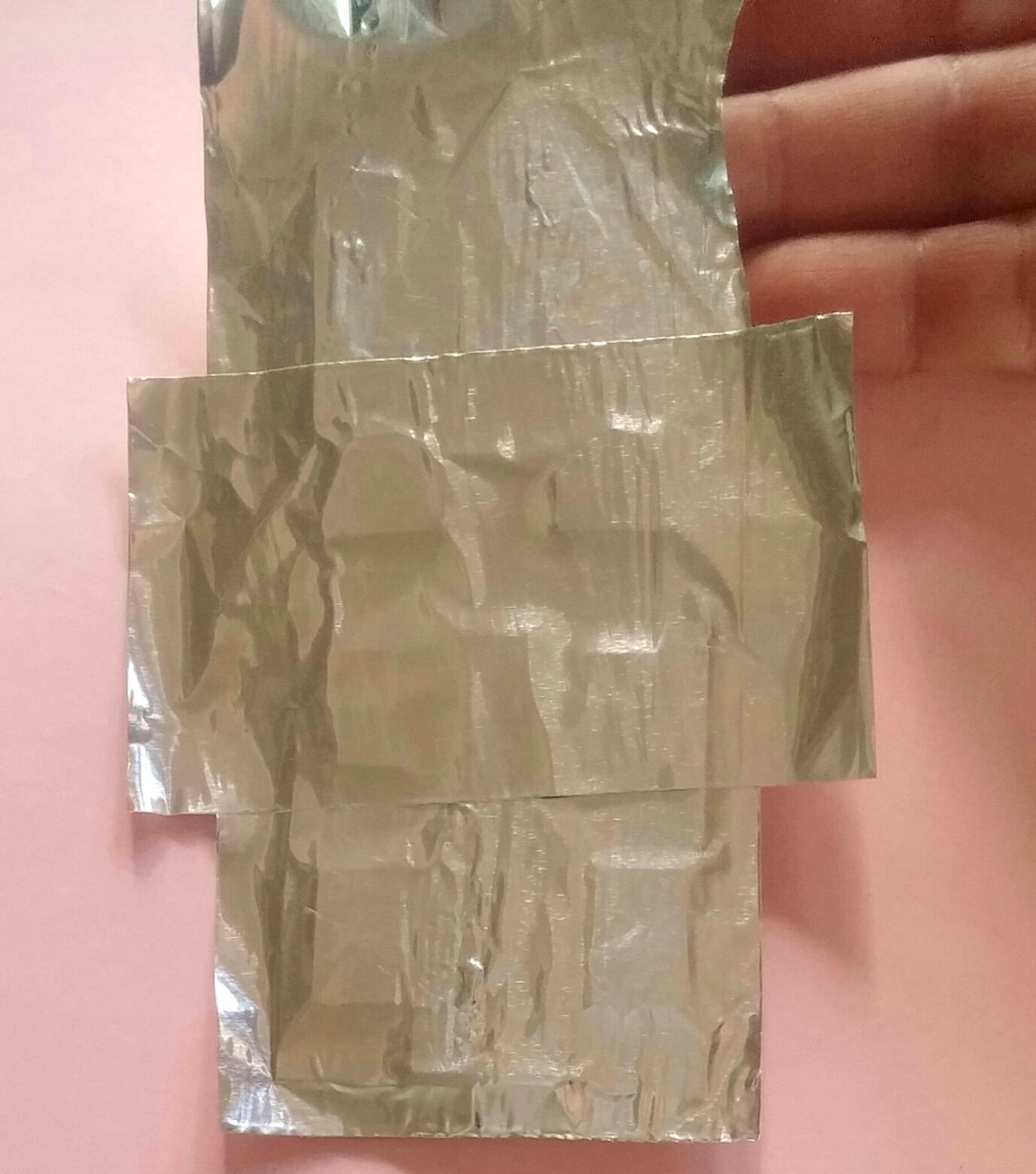 To make an attached stand, cover a scrap of cardboard with silver tape, then attach it to the house with more tape forming a hinge. Here you can see the stand in the mirror: