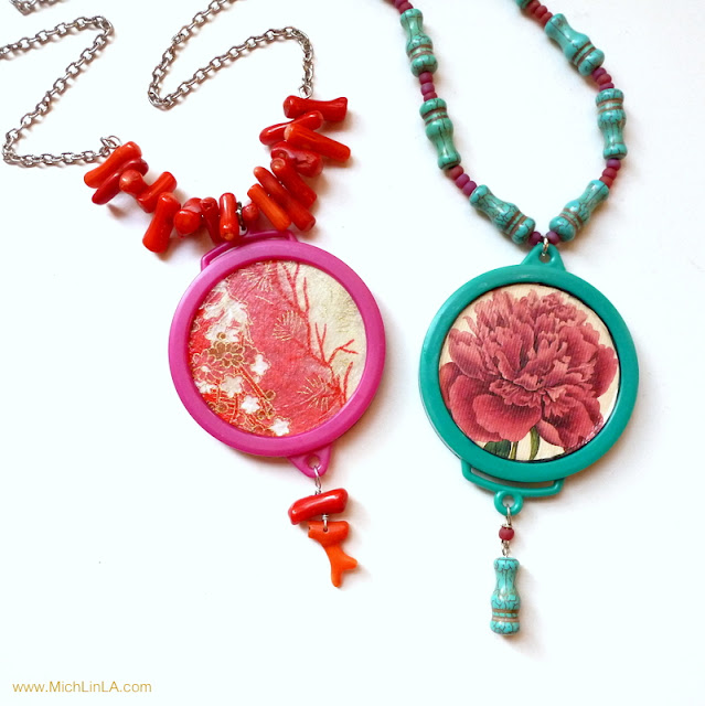 If you're just joining us, I made these big decoupaged pendants, upcycled from something mysterious.