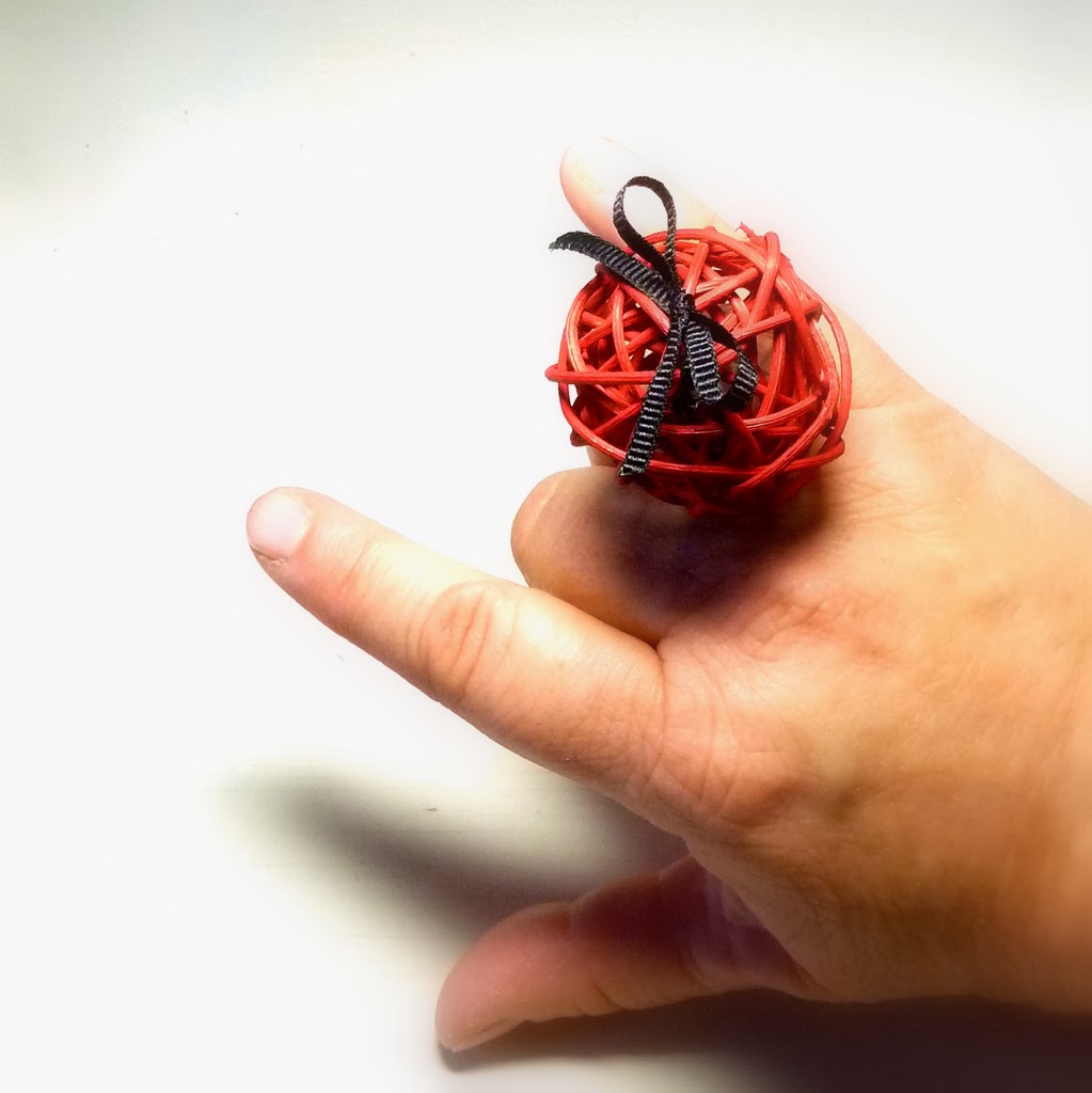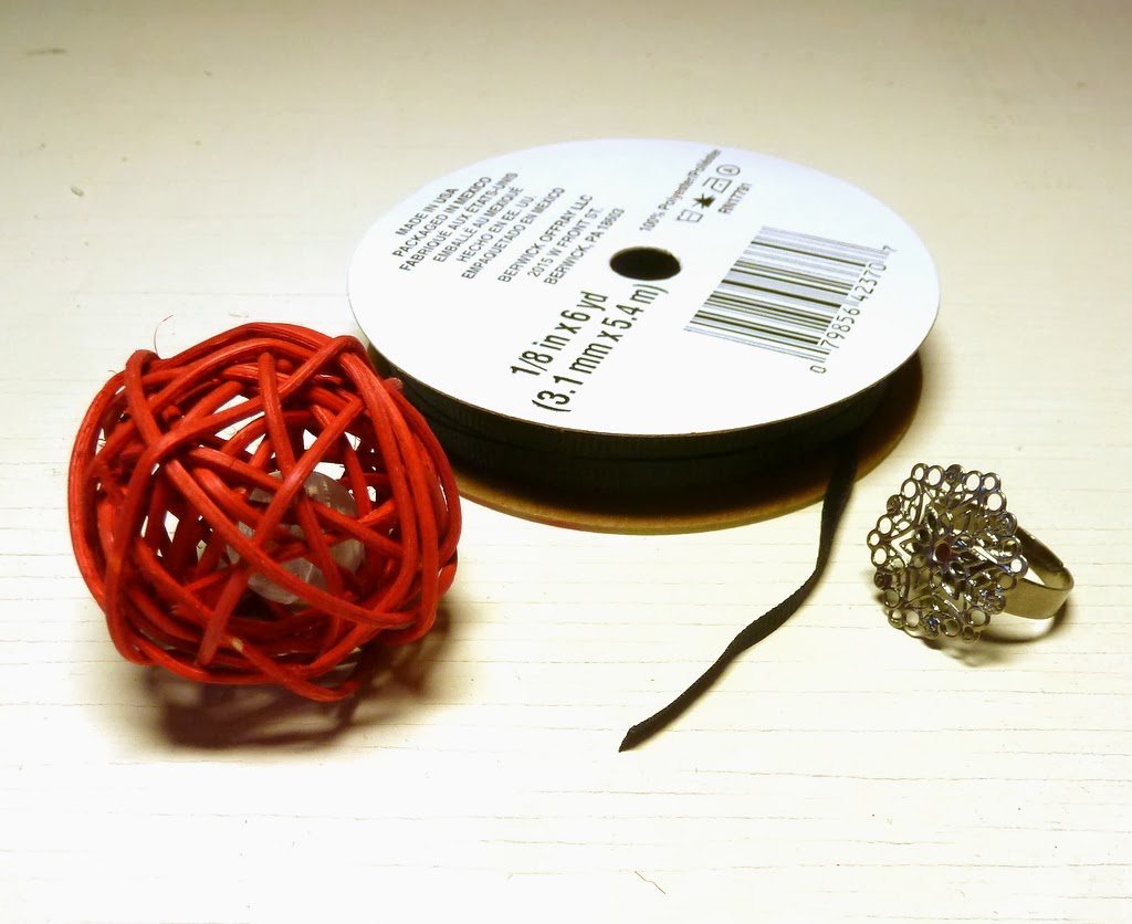 Ready to DIY? Let's start with the cocktail ring. You need a kitty ball, a ring blank and some skinny ribbon.