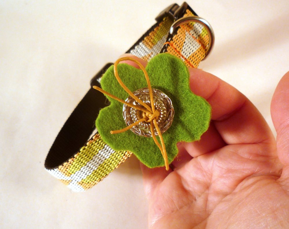 I made the cute collar flower from two waiting-to-be-repurposed items I had been saving for just such an occasion. (Both from the dollar store. I am very predictable that way.)