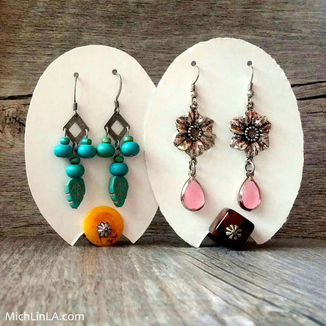 Just tuck some recycled cardboard between the two beads, and voila, earring display stands! Yep, they stand up on their own.
