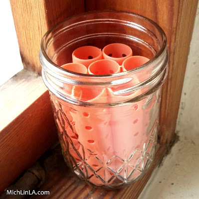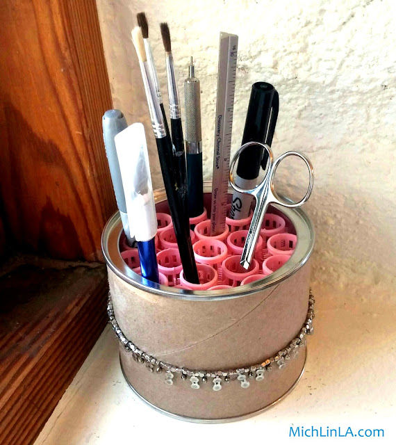 All very well, but I still had fifty rollers to use up. Here is the answer: these cylindrical darlings will organize your life! Simply stuff some rollers into various upcycled containers and WHEE! Storage for all kinds of things! Look inside this cut-down milk bottle: