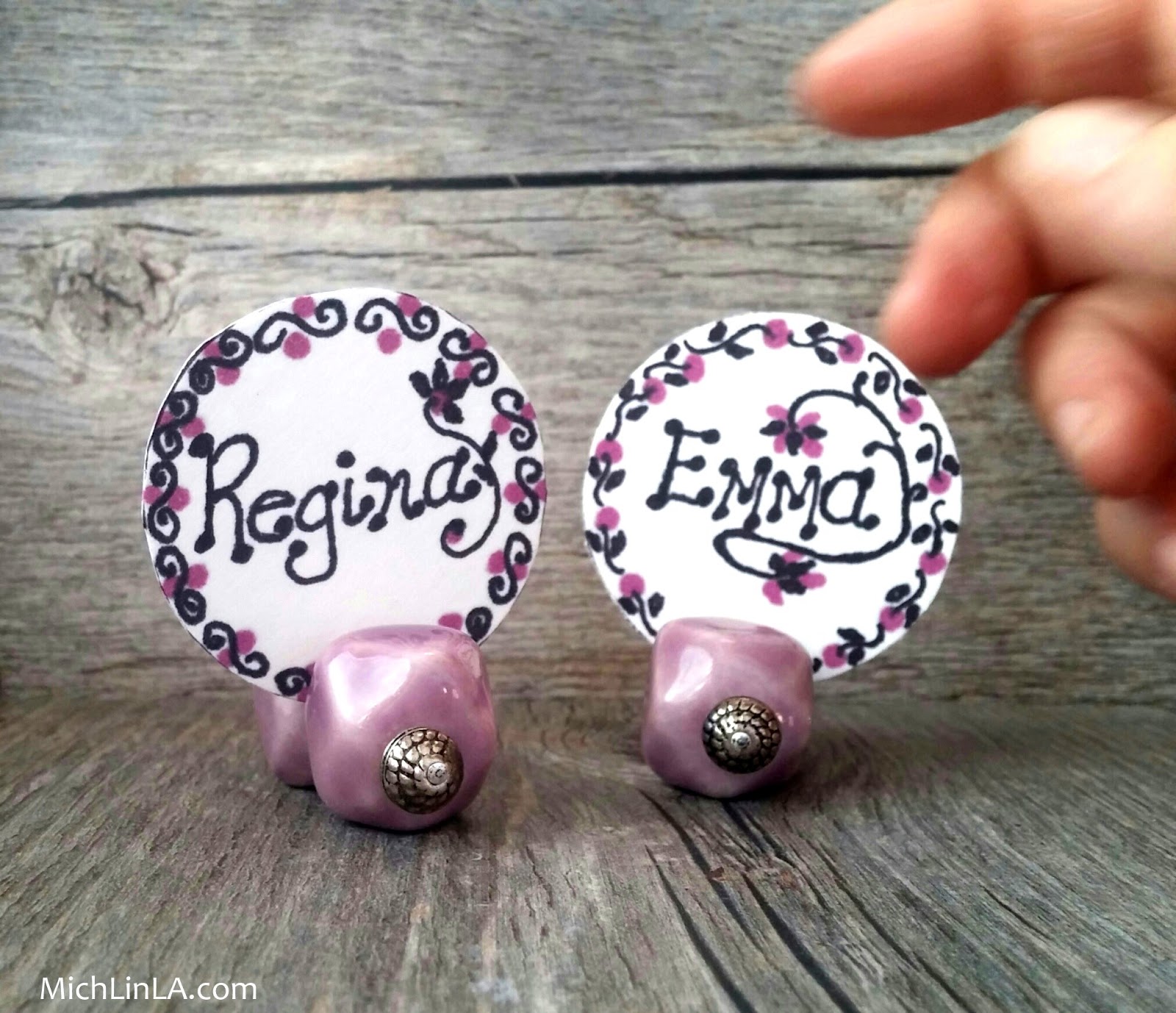 They have lots of other uses, too - like place card holders, buffet table signs, anywhere you need to label or display something while maintaining a tiny footprint. Fer example, they make the darlingest business card display: