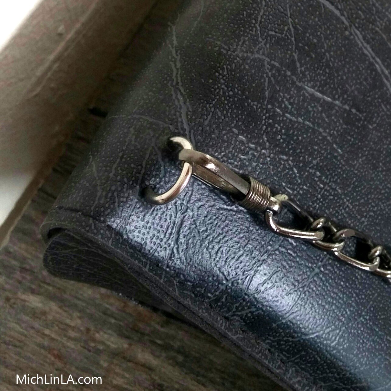 With a sharp nail or a push pin, poke 2 holes in the front of the eyeglass case: one near each edge, about halfway up. (If there's a hard structure underneath, pound the nail through with a hammer.) Thread a jump ring through each hole, and add the beaded chain. Like so: