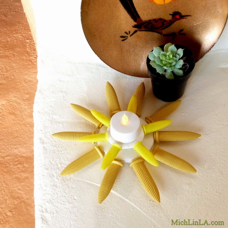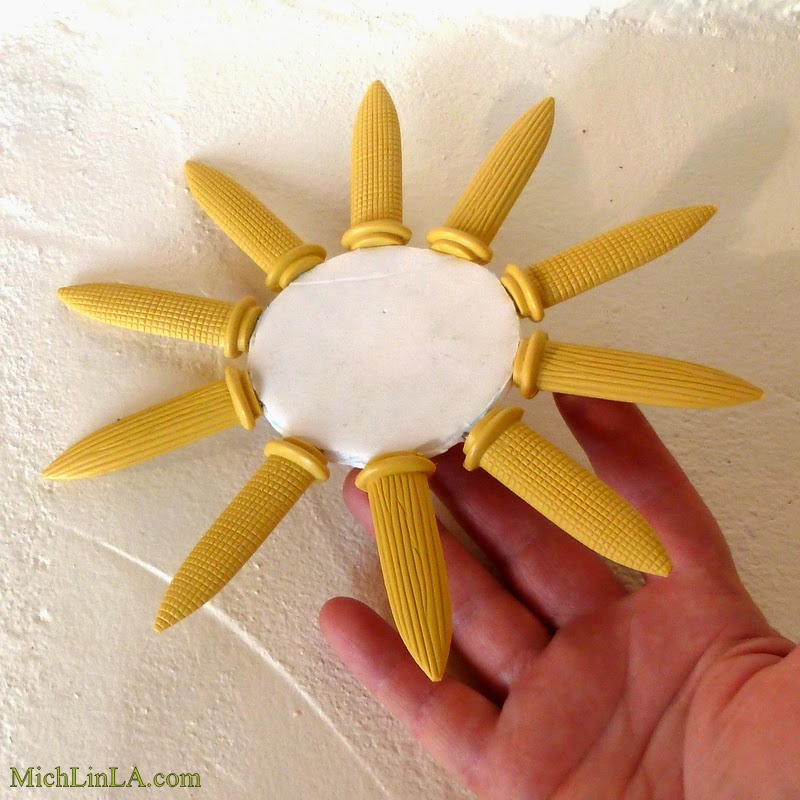 Hmm, I am also thinking about making a great big one to hang up, with either a mirror or a photo in the center. If I painted the corncob rays silver, I'd have metallic starburst wall decor.